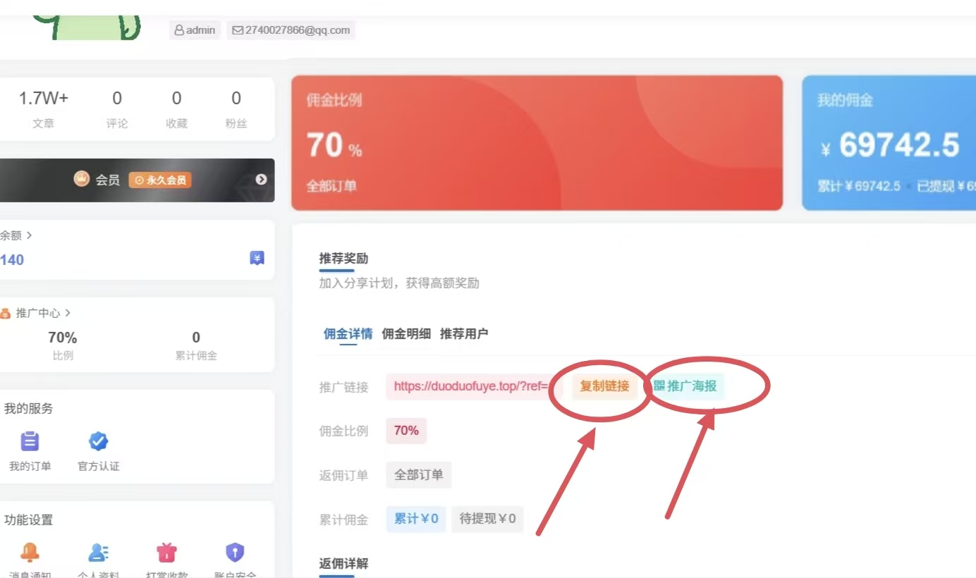 ☁ 在用户中心-推广中心-复制链接或推广海报